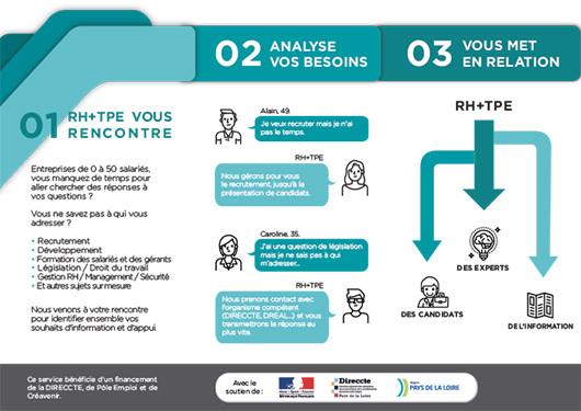 Notre service RH+ TPE a été spécifiquement conçu pour vous accompagner dans vos démarches, vous apporter les premières réponses, être la passerelle entre vous et les bons interlocuteurs et candidats !
